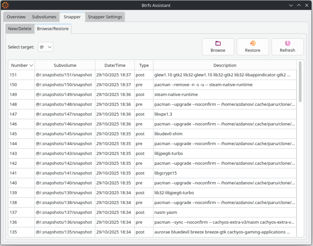 You can also use the Btrfs Assistant application to manage your snapshots. It provides a graphical interface to create, delete, and restore snapshots.