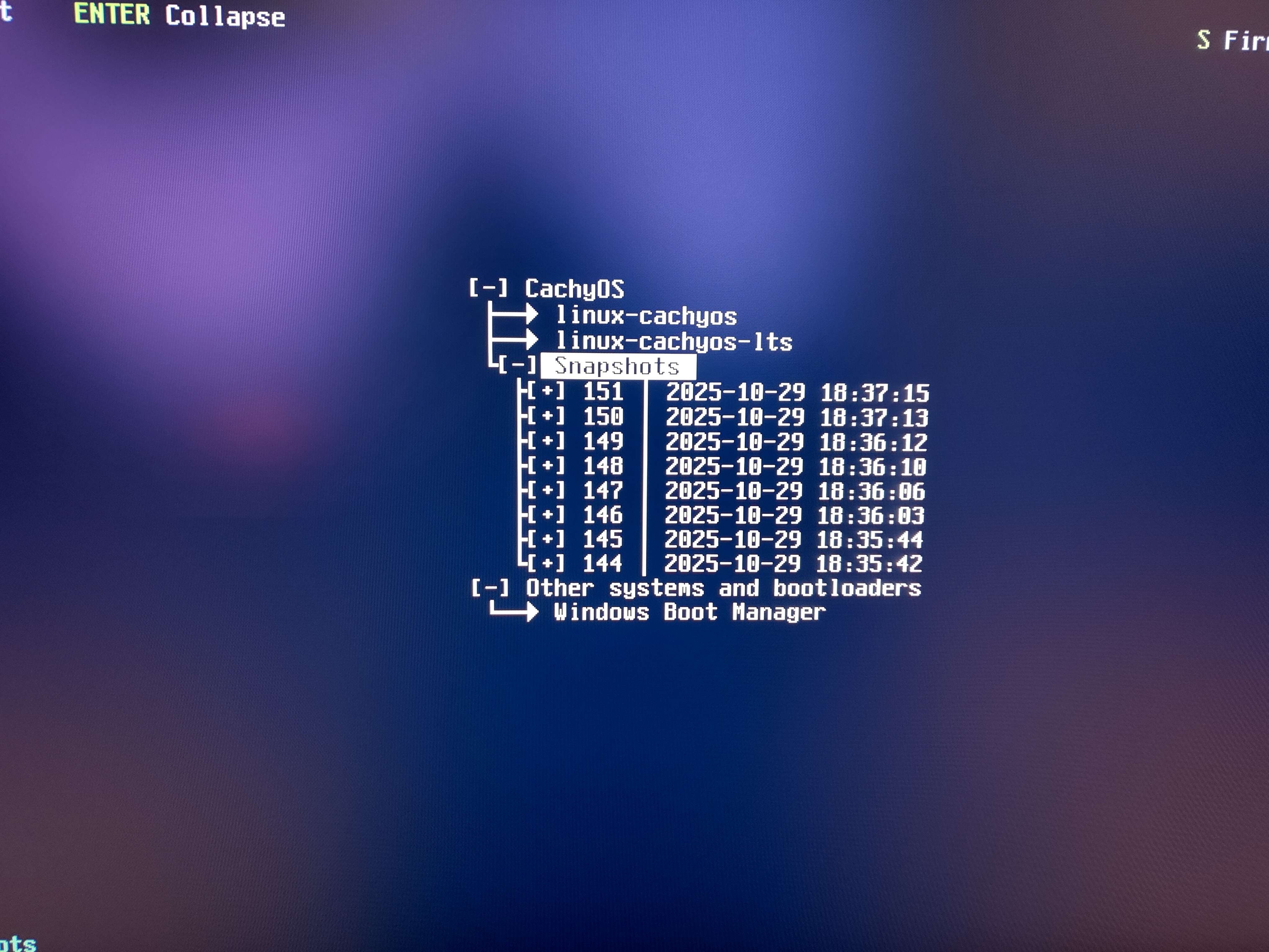 Section titled “Using a Btrfs snapshot as a rollback point”A BTRFS snapshot appears as an additional boot entry in your bootloader menu and is usually named something like: