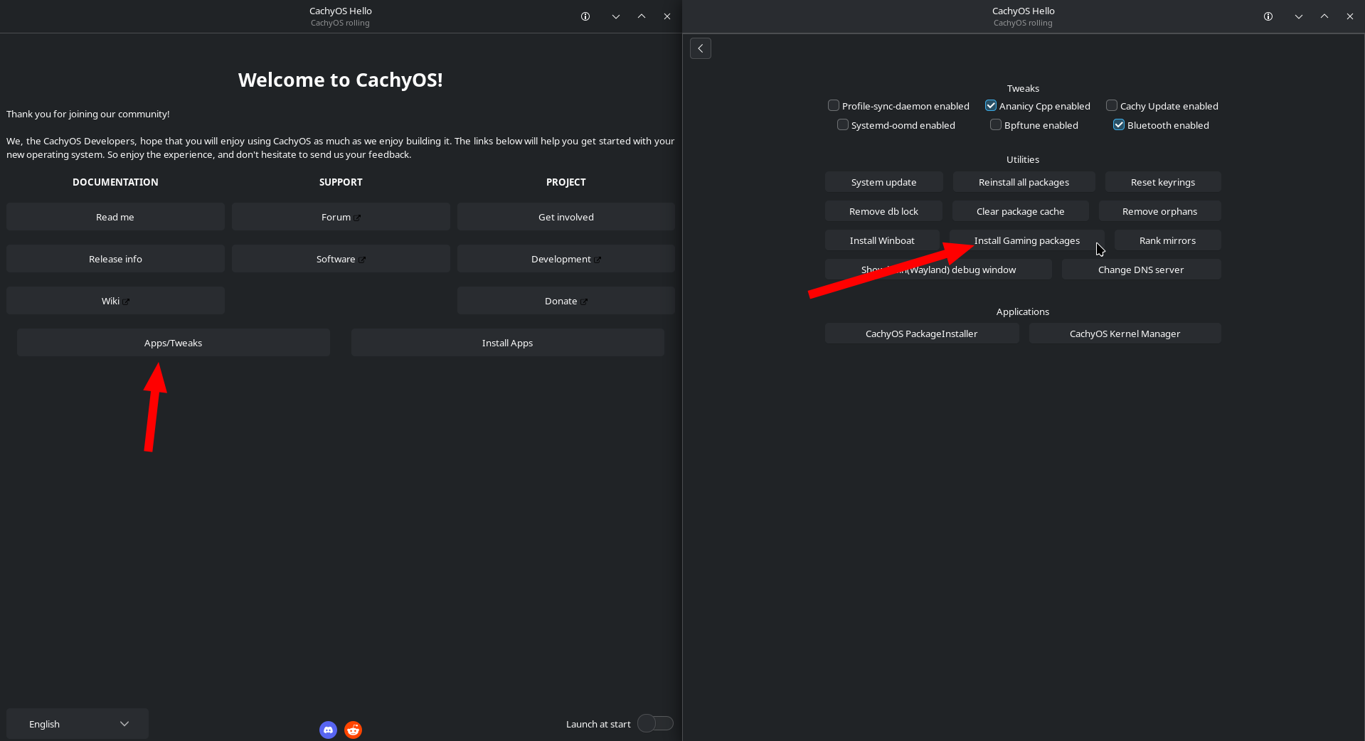 - Open CachyOS Hello. Go to Apps/Tweaks and click on