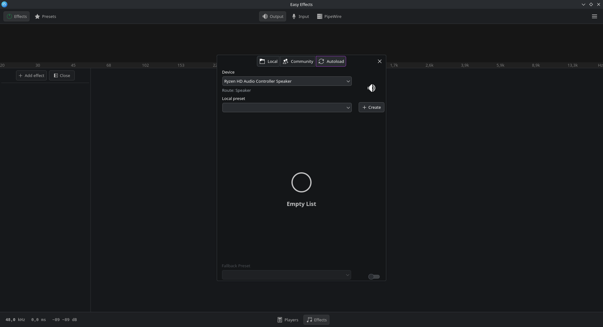 - Autoload presets for multiple devices: Use the PipeWire > Presets Autoloading tab to associate specific presets with different output devices (e.g., Speakers vs. Headphones) for seamless switching.