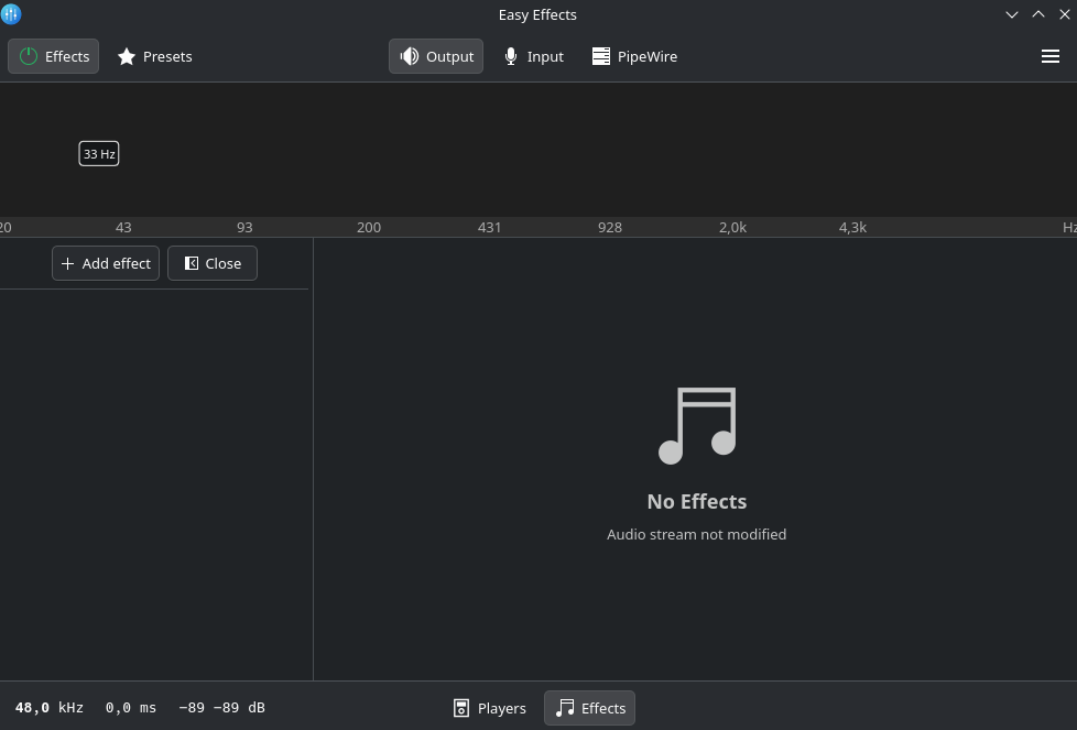 easyeffectsin the terminal. - Navigate to the Output tab to manage effects applied to your speaker audio.