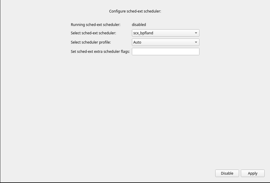 # List of scx_schedulers: scx_bpfland scx_central scx_flash scx_lavd scx_layered scx_nest scx_qmap scx_rlfifo scx_rustland scx_rusty scx_simple scx_userlandSCX_SCHEDULER=scx_lavd